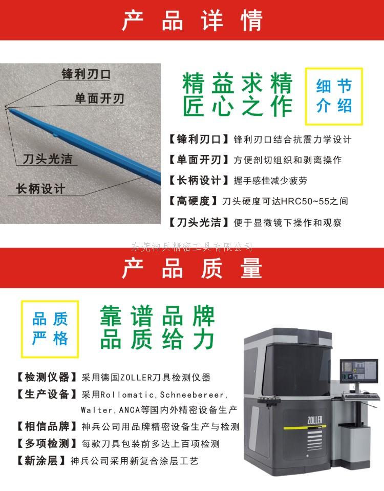 产品名称:剖切刀 产品别名:组织剖切刀,中血管剥离刀,显微外科手术刀 剖离刀规格:按要求定制或来图来样生产 剖离刀材料:医用级不锈钢 是否定制:医用剖离手术刀是定制品,需提供图纸或样品加工定制 剖离手术刀价格:神兵精密生产剖切刀或剥离刀等医用刀具为定制品,来电咨询具体价格 剖切刀用途:用于中血管和软组织精细剖切以及剥离 特点:神兵精密工具是一家专注医疗刀具和医用刀具生产加工厂家,采用进口五轴CNC经过开粗、粗磨、开槽,精加工、精磨、开刃以及抛光或其它表面处理等几十道工艺制作完成。剖切刀冠脉刀以及眼科手术刀和其他医疗刀具品质稳定,刃口锋利,切削流畅,排削顺畅,不生锈不变色方便保存和使用,是医疗手术中的好工具。 相关产品:眼科手术刀、医用铣刀、穿刺针 相关文章: